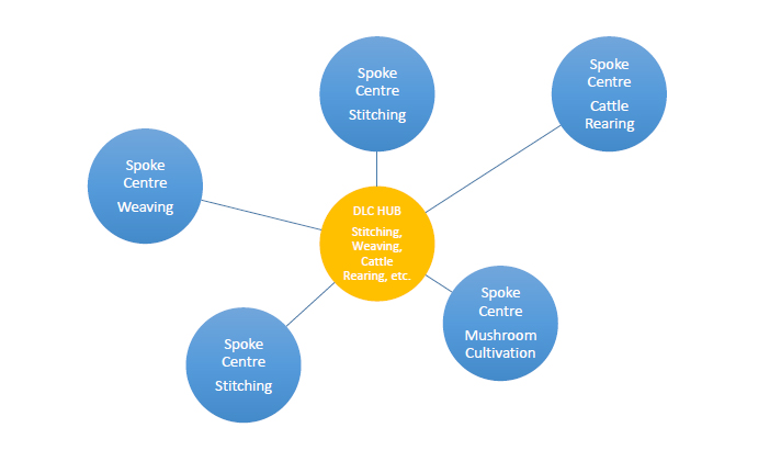 The Training Centre HUB called “Drishtee Livelihood Centres (DLC)”is created in key block areas covering all type of paid training – mobilization and awareness, in the 5-10 kms area around. In the 10-15 surrounding villages, Spoke centres for the DLC are created as per training demand and requirement for short term training. Trained and interested candidates in the Spoke Centres are promoted to the Hub centre for advance training focused on livelihood output.